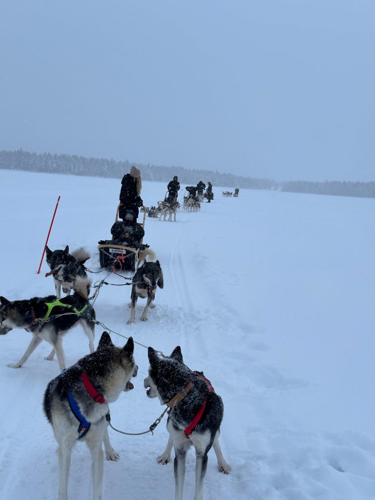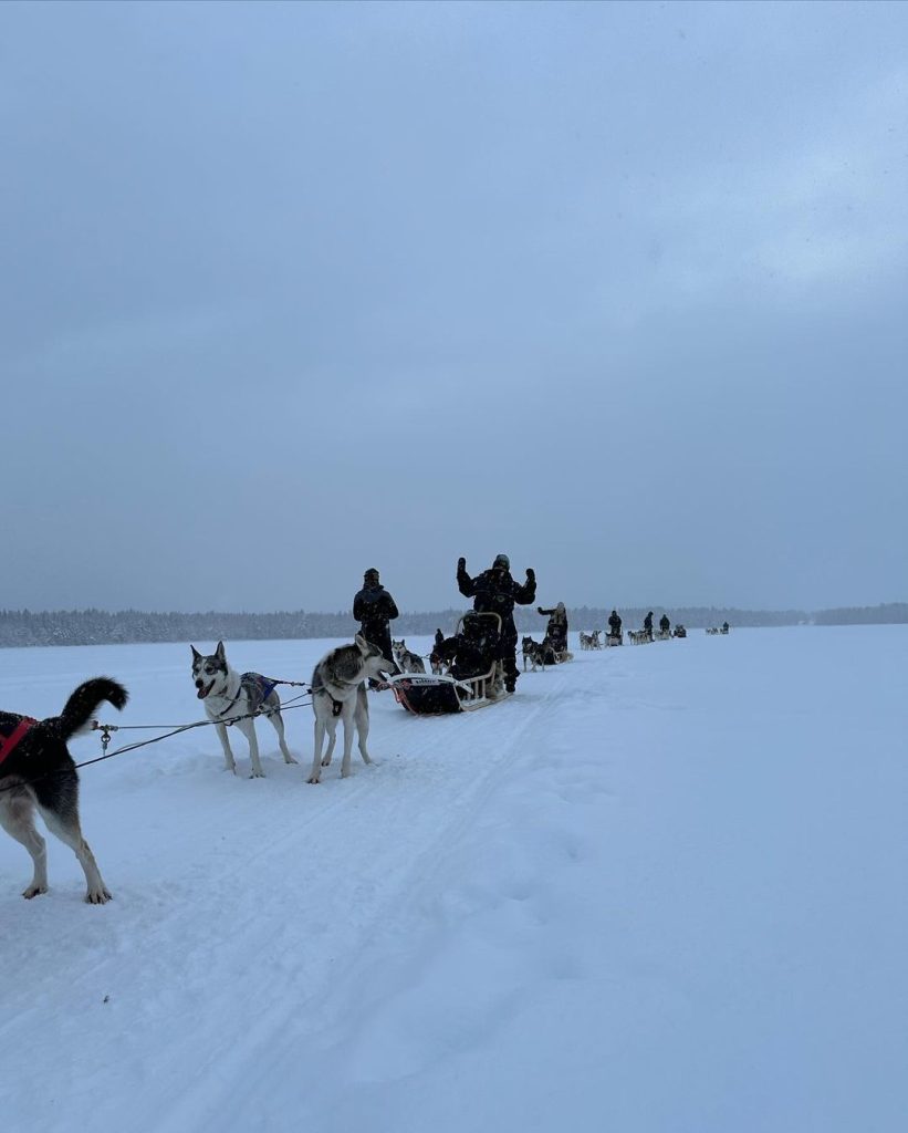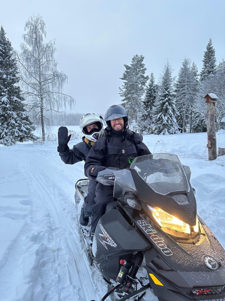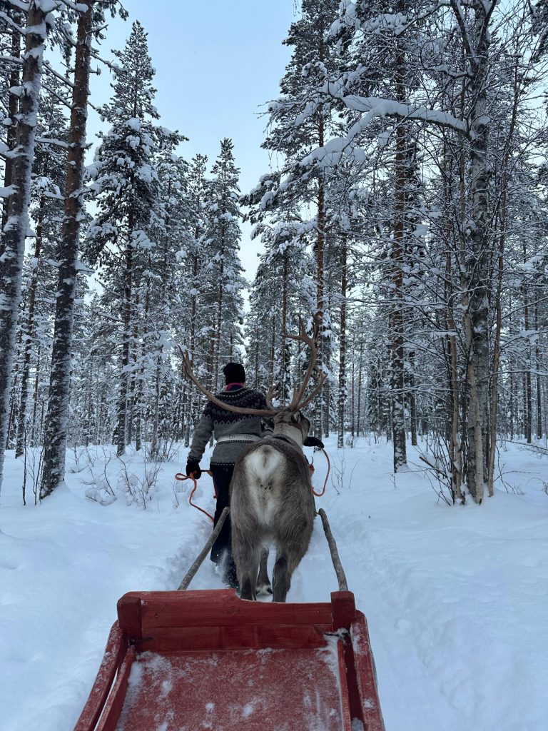 Llegamos hastaRovaniemi, allí conocimos a Elfos, condujimos motos de nieve, comimos salmón y reno, cantamos frente al fuego mientras hacíamos salchichas, montamos en trineo de renos, les dimos de comer…